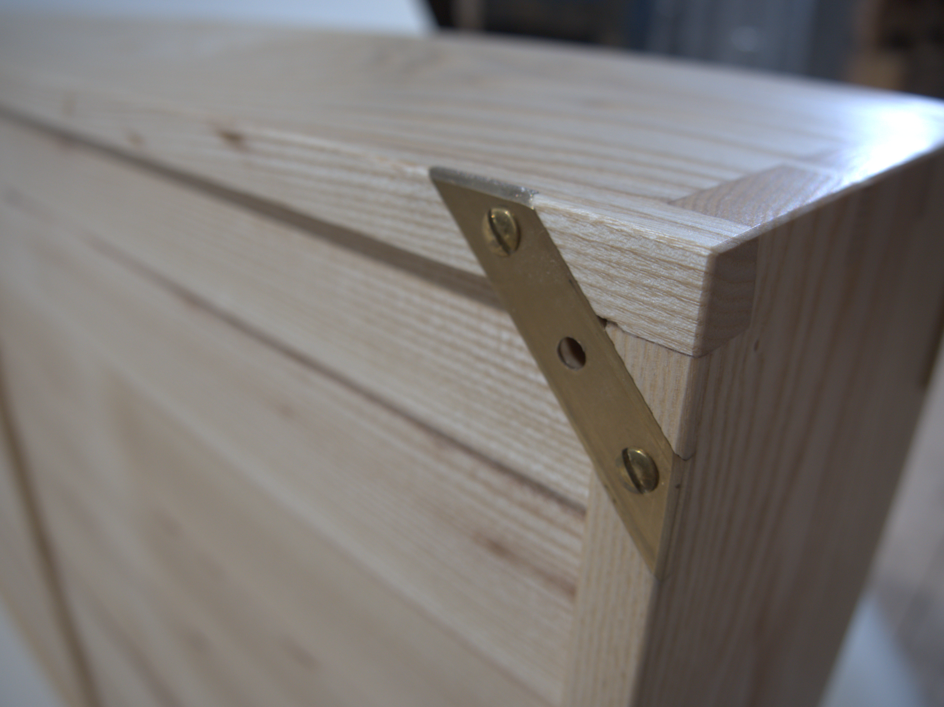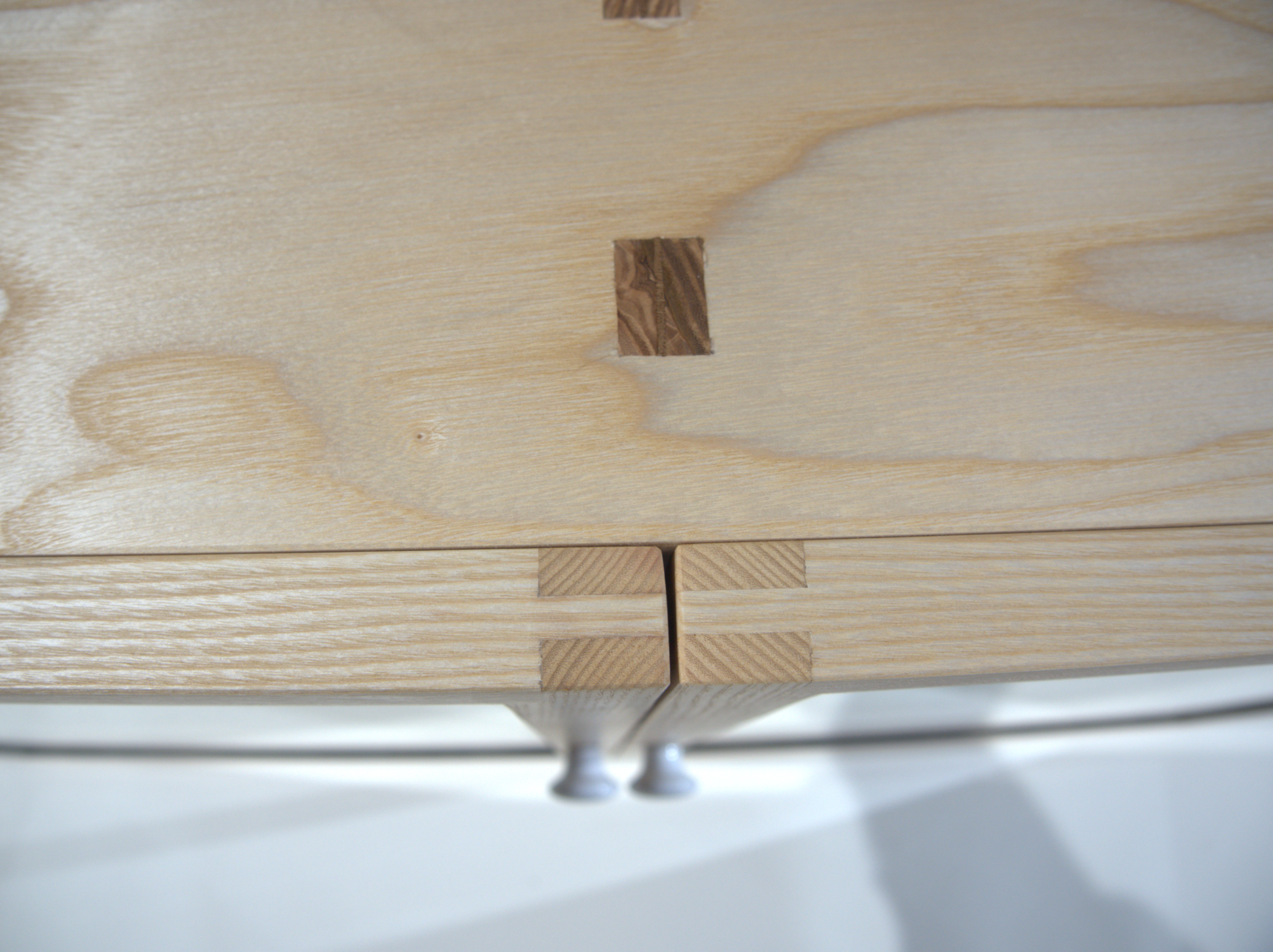 Dieser Spiegelschrank aus massivem Eschenholz ist mit seinen von Hand gezinkten Korpusverbindungen, der durchgezapften und verkeilten Mittelseite und den mit Schlitz und Zapfen verbundenen Spiegelrahmen ein Möbelstück für die Ewigkeit. Gute Pflege natürlich vorausgesetzt. Die doppelseitig verspiegelten Glasfüllungen der Türen sind mit Leisten eingesetzt, die mit Hautleim verleimt sind. Hautleim lässt sich unter Einwirkung von Wärme wieder lösen, sodass bei einem Schaden des Spiegelglases eine Reparatur möglich ist. Das Spiegelglas ist Innen wie Außen mit einem Dauerelastischen Klebstoff zum Ramen hin abgedichtet, sodass kein Kondens- oder Putzwasser in den Rahmen eindringen kann.